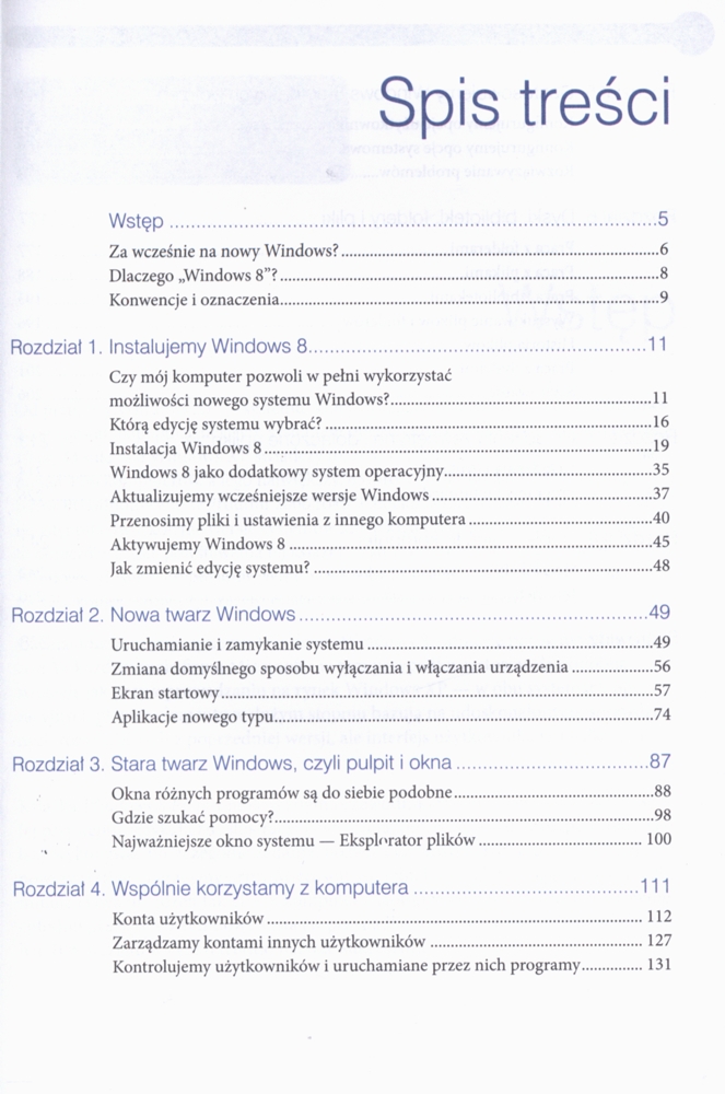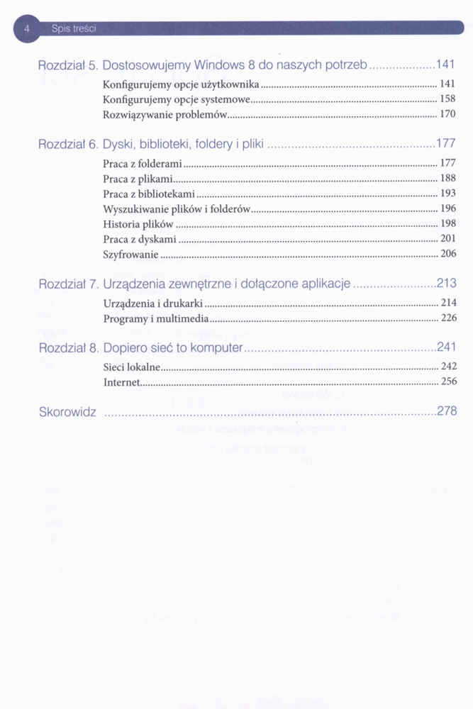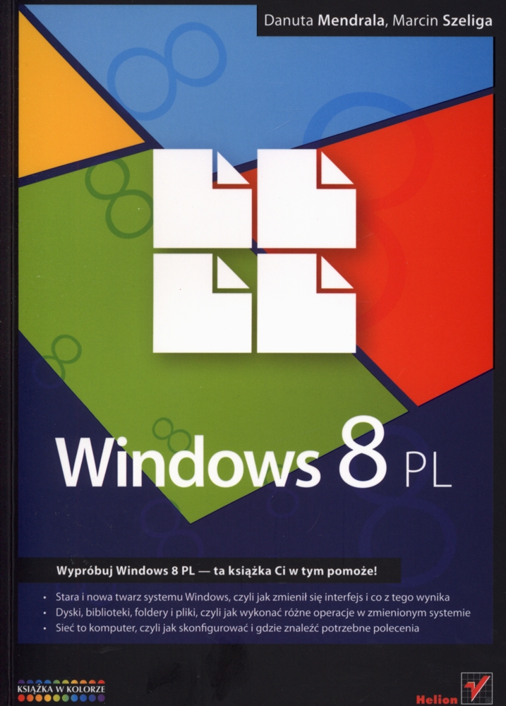 Na okł. i s. tyt.: Wypróbuj Windows 8 PL-ta książka Ci w tym pomoże! Stara i nowa twarz systemu Windows, czyli jak zmienił się interfejs i co z tego wynika. Dyski, biblioteki, foldery i pliki, czyli jak wykonać różne operacje w zmienionym systemie. Sieć to komputer, czyli jak skonfigurować i gdzie znaleźć potrzebne polecenia.