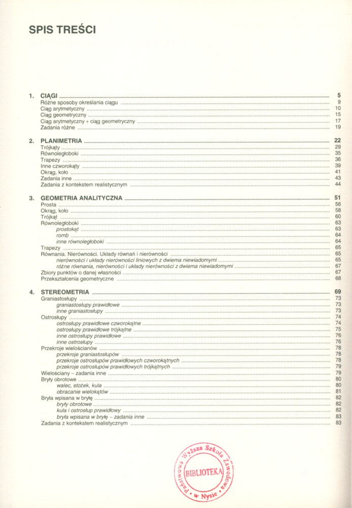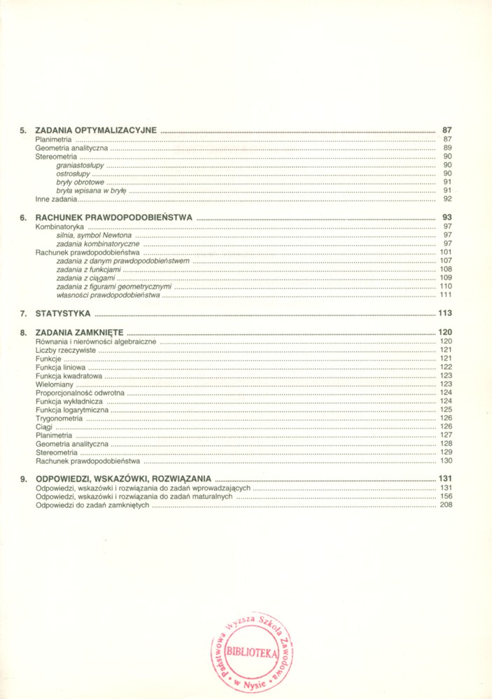 Na okł.: wzory, twierdzenia, definicje, 160 zadań wprowadzających z rozwiązaniami, 841 zadań na poziomie egzaminu maturalnego w tym 220 zadań z rozwiązaniami, 130 zadań zamkniętych.